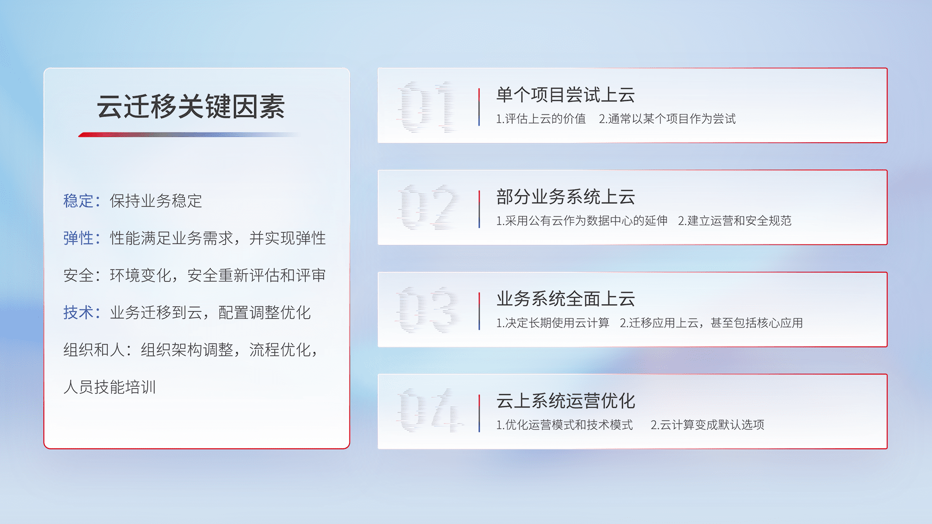 结合实际业务,,从规划设计、、云平台选型、、、、云原生改造、、数据迁移、、集成交付,,迁移全过程为客户识别最佳上云路径,,,做好风险识别管理,,设计网络架构、、、、身份权限、、、安全审计合规、、、、操作审计、、、、日志审计、、监控告警策略、、、、多站点容灾设计等,,,对云上基础设施进行整体规划,,提升IT治理水平,,,以满足弹性、、、、高可用、、、高性能的需求。。。。