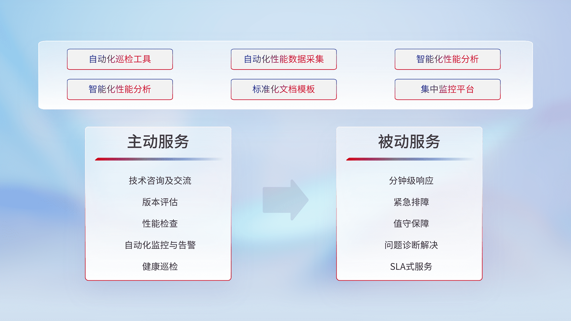 智能化工具和标准化文档,,,,保障服务质量,,,提供主动服务(包含技术咨询、、、、版本评估、、、性能检查、、、、自动化监控与告警、、、健康巡检)和被动服务包含(分钟级响应、、、紧急排障、、、值守保障、、、问题诊断解决、、、、SLA服务)。。。。